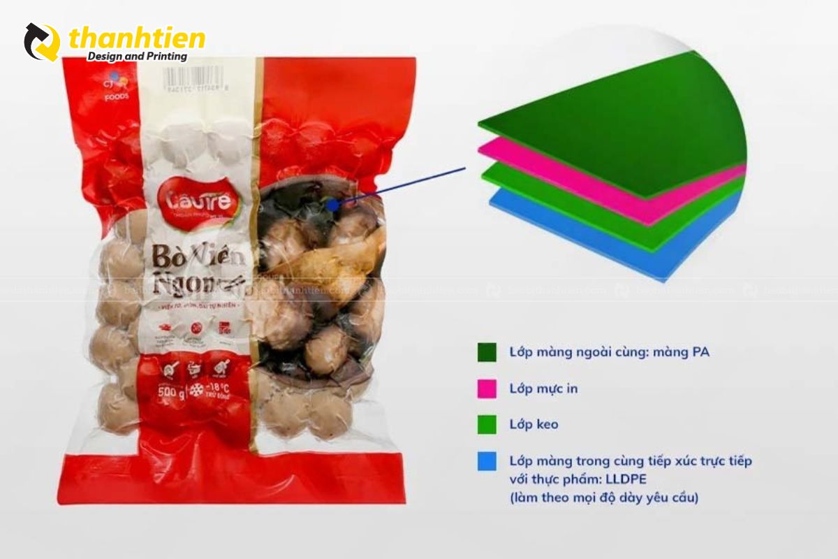 Lớp màng ngoài, thường sử dụng PA, có độ bền cao, chống thấm nước và chống ẩm, đồng thời chịu được nhiệt độ thấp trong thời gian dài. Đây cũng là lớp nền lý tưởng để in ấn hình ảnh, logo và thông tin thương hiệu mà không lo bong tróc hay phai màu. Lớp màng trong, thường làm từ PE, tăng cường độ chắc chắn, khả năng chịu lực và kháng va đập, đồng thời hỗ trợ hàn biên chắc chắn để đảm bảo bao bì kín khít, bảo vệ sản phẩm khỏi vi khuẩn và các tác nhân bên ngoài.