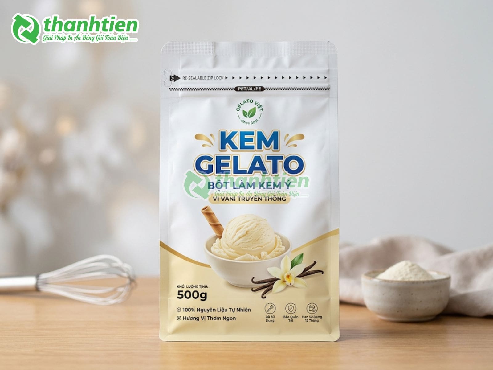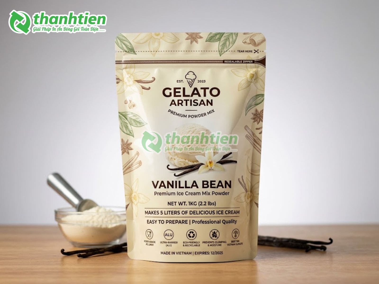 Bao bì bột làm kem của nổi bật với khả năng chống ẩm, chống oxy hóa vượt trội nhờ lớp Aluminum chắn sáng và hơi nước hoàn hảo. Nhờ đó, bột kem luôn giữ được độ khô ráo, hương thơm nguyên vẹn và chất lượng ổn định trong thời gian dài, ngay cả khi lưu kho lâu hoặc vận chuyển xa. Zipper tiện lợi giúp người dùng mở đóng nhiều lần mà không lo bột bị đổ hoặc nhiễm ẩm, rất phù hợp cho kinh doanh online, siêu thị mini và cửa hàng kem tươi. Ngoài ra, thiết kế đẹp mắt với in ấn cao cấp còn tăng giá trị nhận diện thương hiệu, giúp sản phẩm của bạn nổi bật giữa hàng trăm đối thủ, thu hút khách hàng ngay từ ánh nhìn đầu tiên.