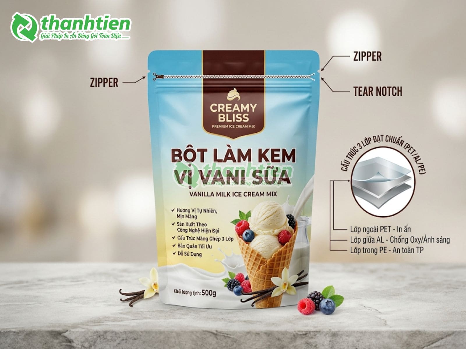 Bao bì bột làm kem được sản xuất theo cấu trúc bao bì màng ghép 2-3 lớp hiện đại, đảm bảo độ bền và khả năng bảo quản tối ưu.