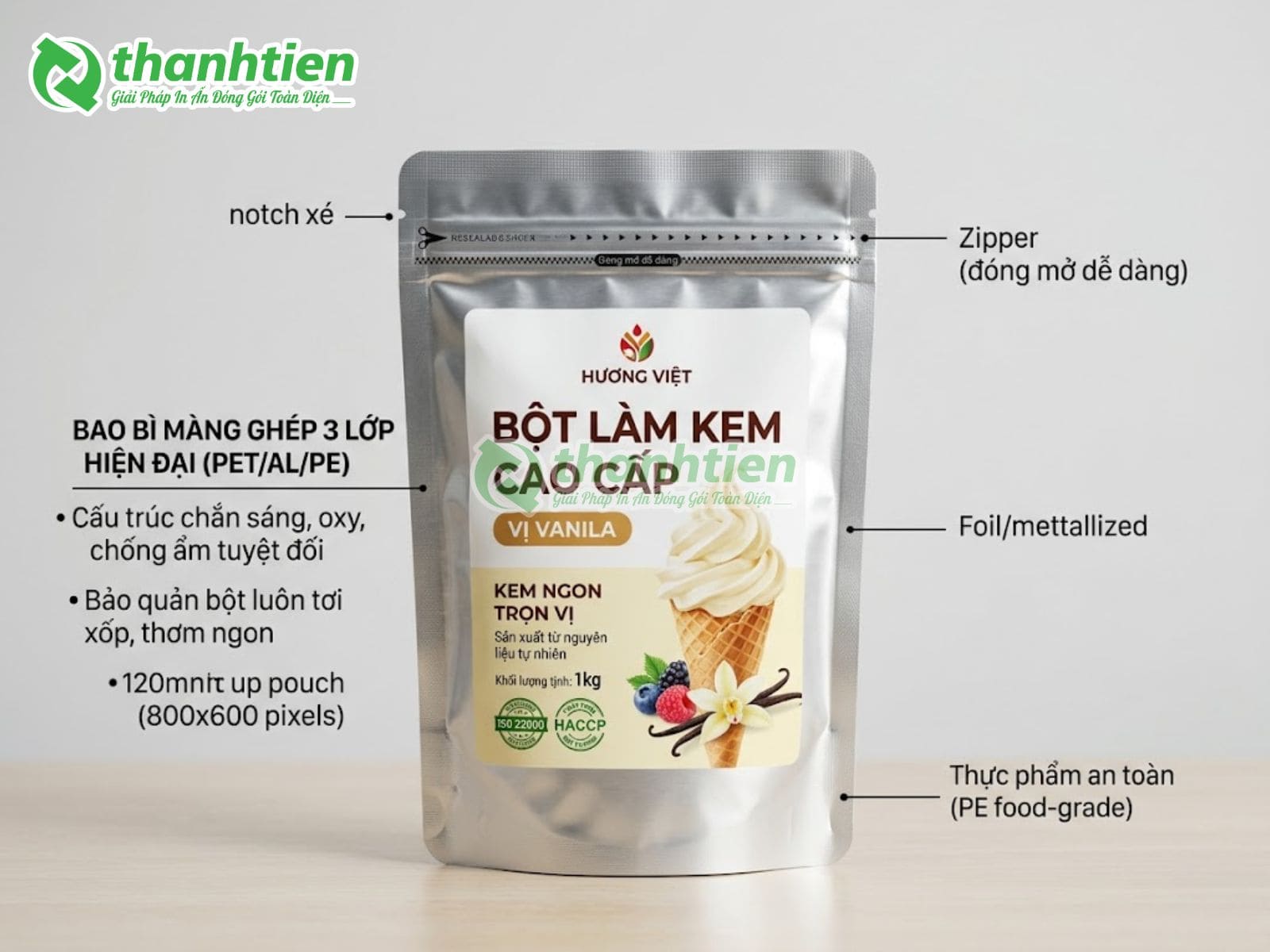 Độ dày dao động từ 80-120 mic, kết hợp công nghệ ghép khô hoặc ghép đùn tiên tiến. Bao bì có thể tích hợp zipper đóng mở dễ dàng, notch xé tiện lợi và van hút chân không tùy chọn, giúp bột kem không bị ẩm mốc, vón cục ngay cả trong môi trường ẩm ướt của Việt Nam. Toàn bộ chất liệu đều thân thiện môi trường, dễ tái chế và không chứa chất độc hại.