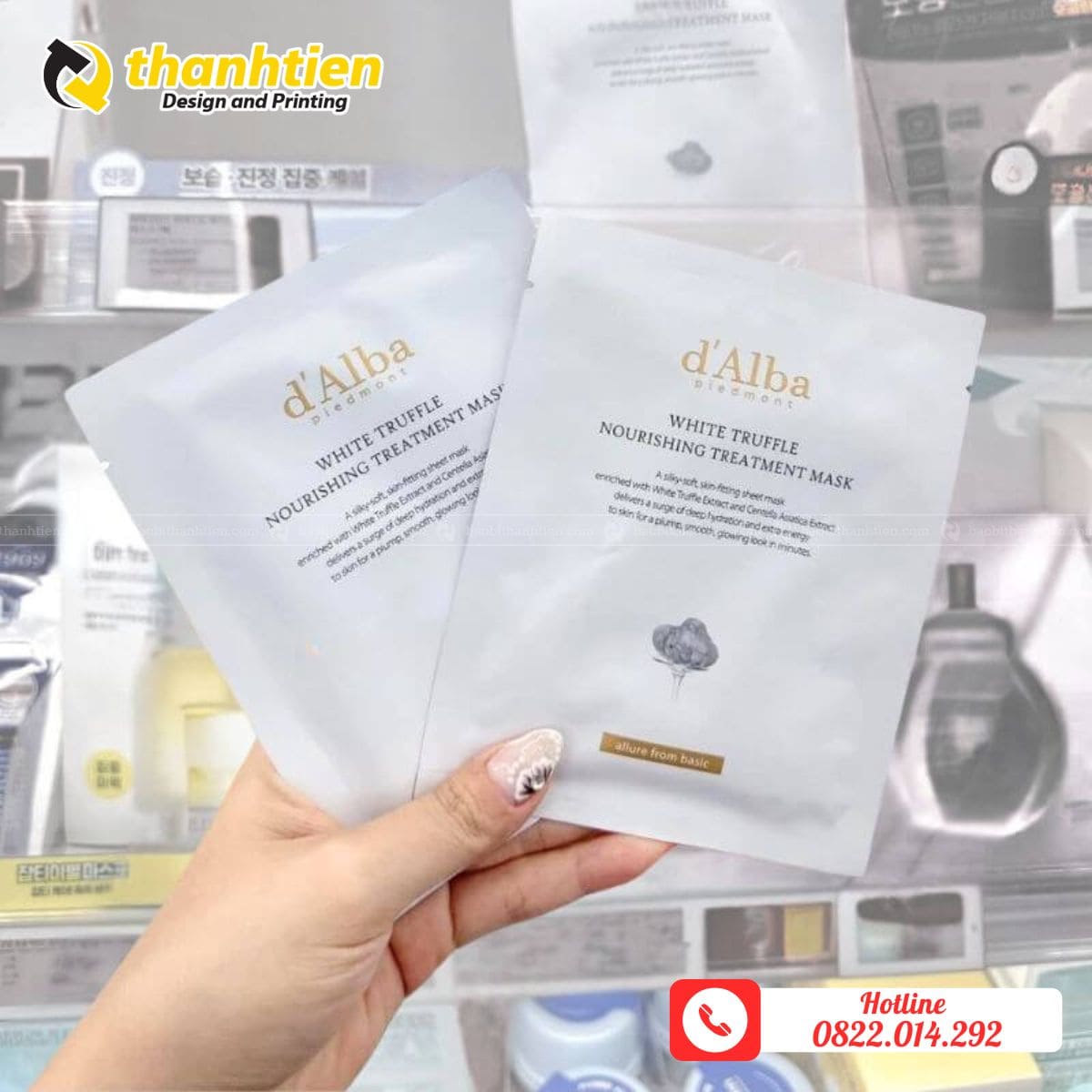- Lớp MPET hoặc AL: Màng nhôm hoặc màng mạ nhôm, tăng khả năng chắn sáng, ngăn tia UV và hơi ẩm, bảo vệ các dưỡng chất bên trong mặt nạ không bị biến đổi chất lượng.