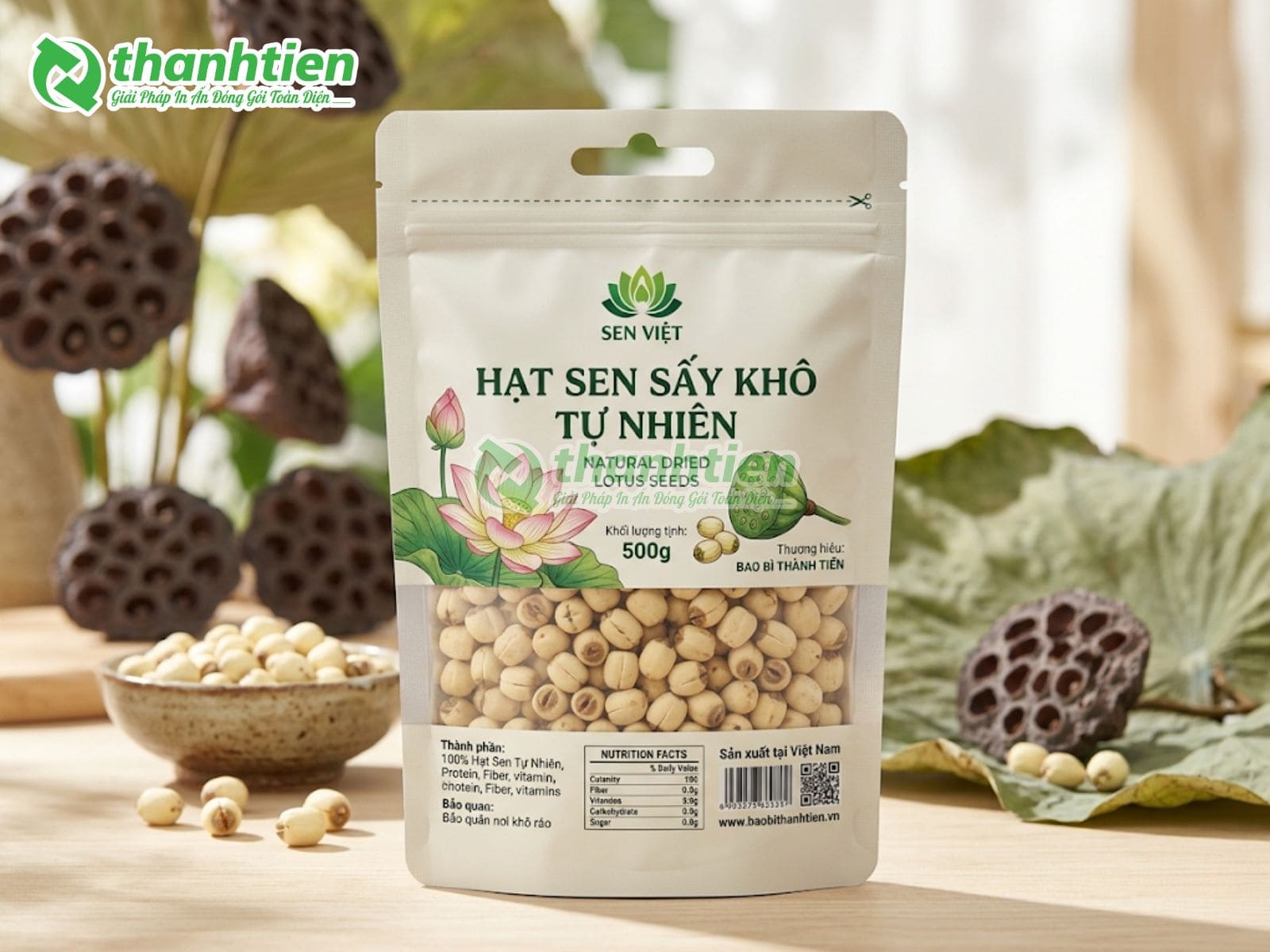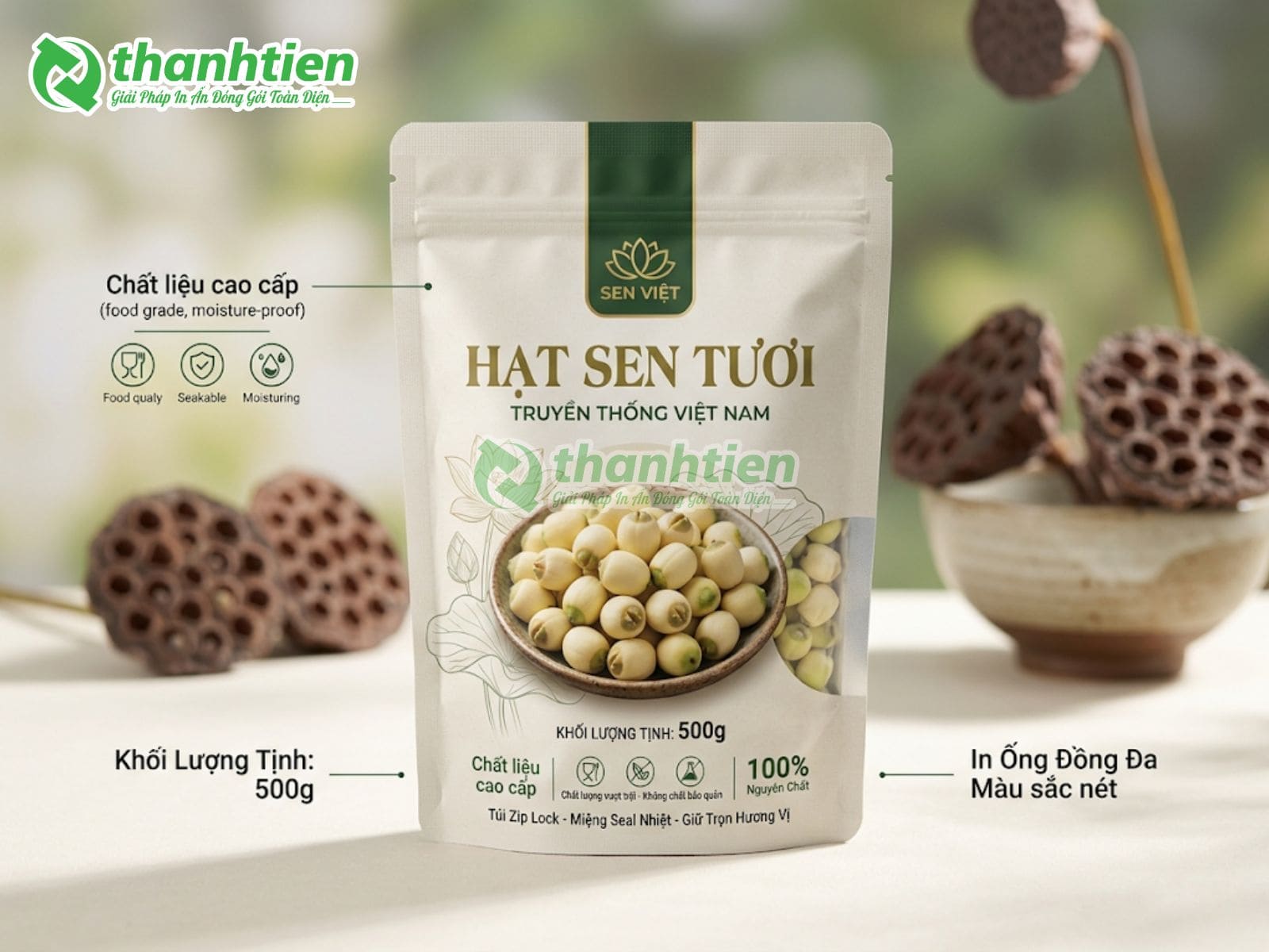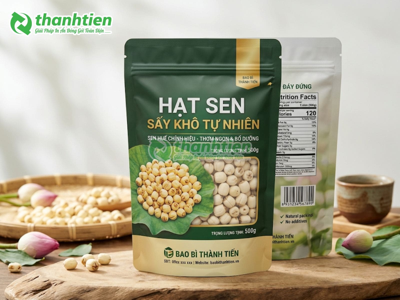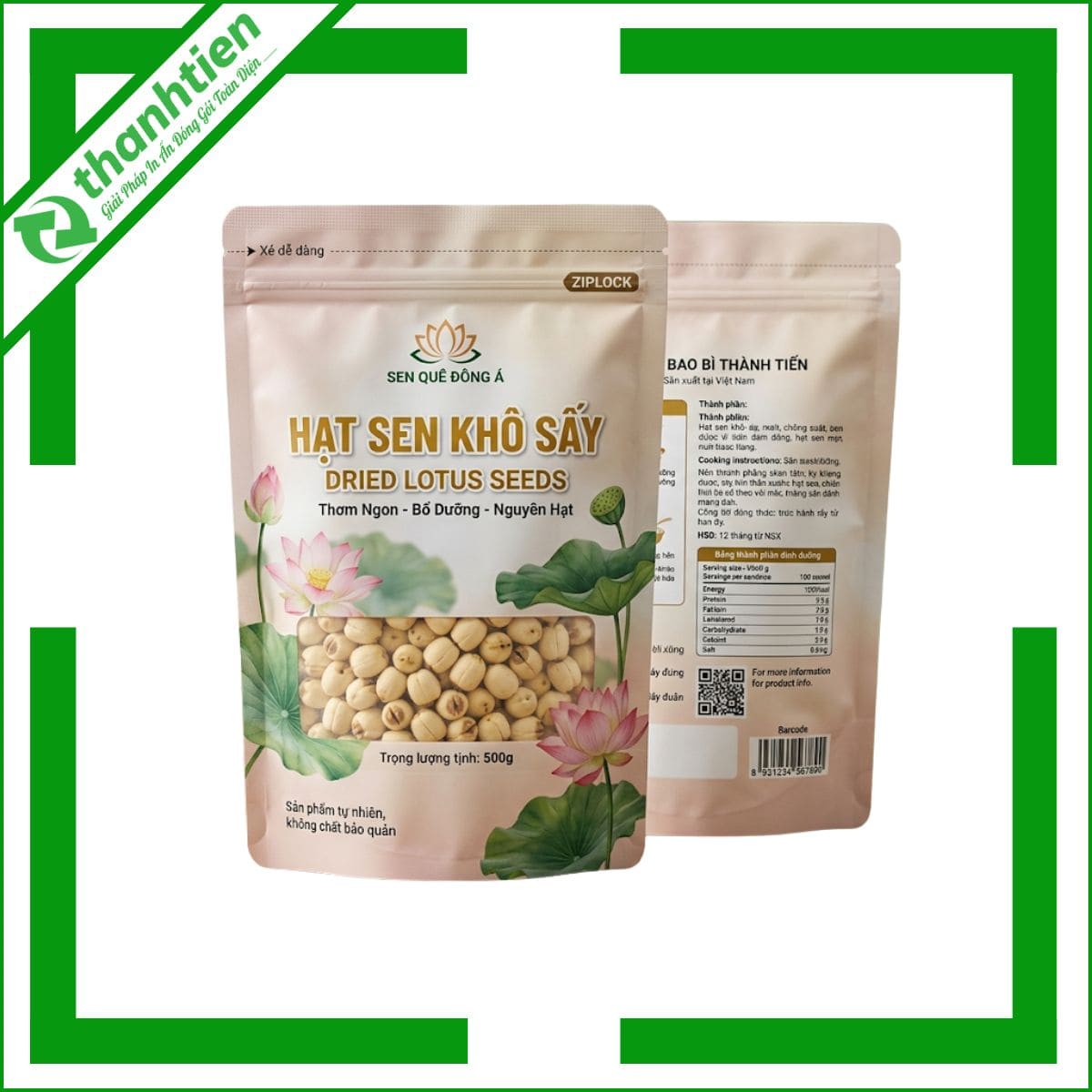 Bên cạnh đó, bao bì với thiết kế đẹp mắt kết hợp thông tin rõ ràng giúp tăng sức hút thị giác, tạo cảm giác cao cấp cho sản phẩm hạt sen. Nhiều khách hàng đánh giá cao bao bì in ấn chuyên nghiệp vì nó góp phần nâng tầm giá trị sản phẩm, dễ dàng phân biệt với hàng trôi nổi trên thị trường. Đây chính là lý do bao bì hạt sen của Bao Bì Thành Tiến luôn được các cơ sở sản xuất hạt sen, cửa hàng nông sản và doanh nghiệp xuất khẩu tin dùng.