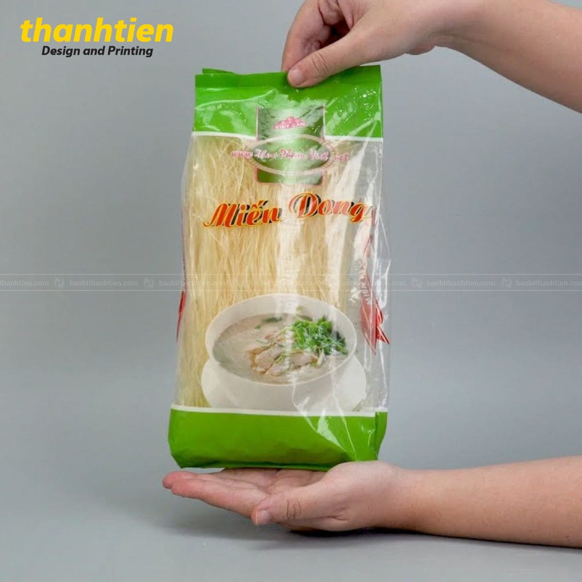 - Màng PE hoặc CPP: Lớp màng trong tiếp xúc trực tiếp với miến, giúp tăng độ bền cơ học, chống rách và tạo độ bám dính tốt khi hàn miệng túi.
