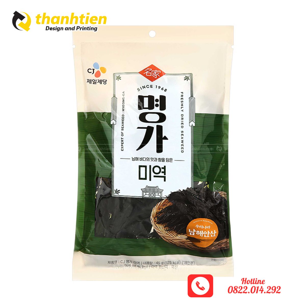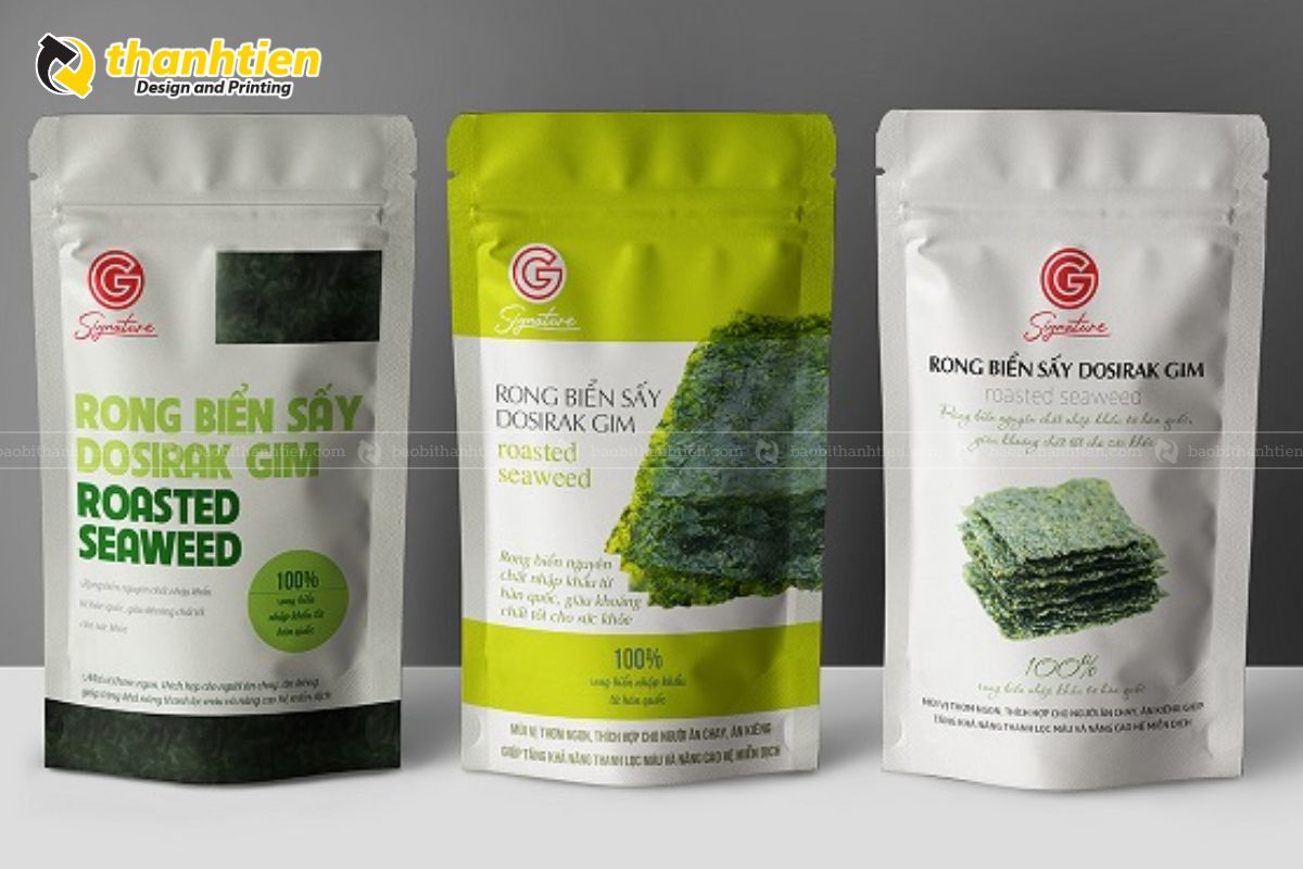 - Túi zip đáy đứng: Tự đứng vững trên kệ, tích hợp khóa kéo tiện lợi, phù hợp với snack rong biển cao cấp hoặc rong biển sấy khô để nấu canh.