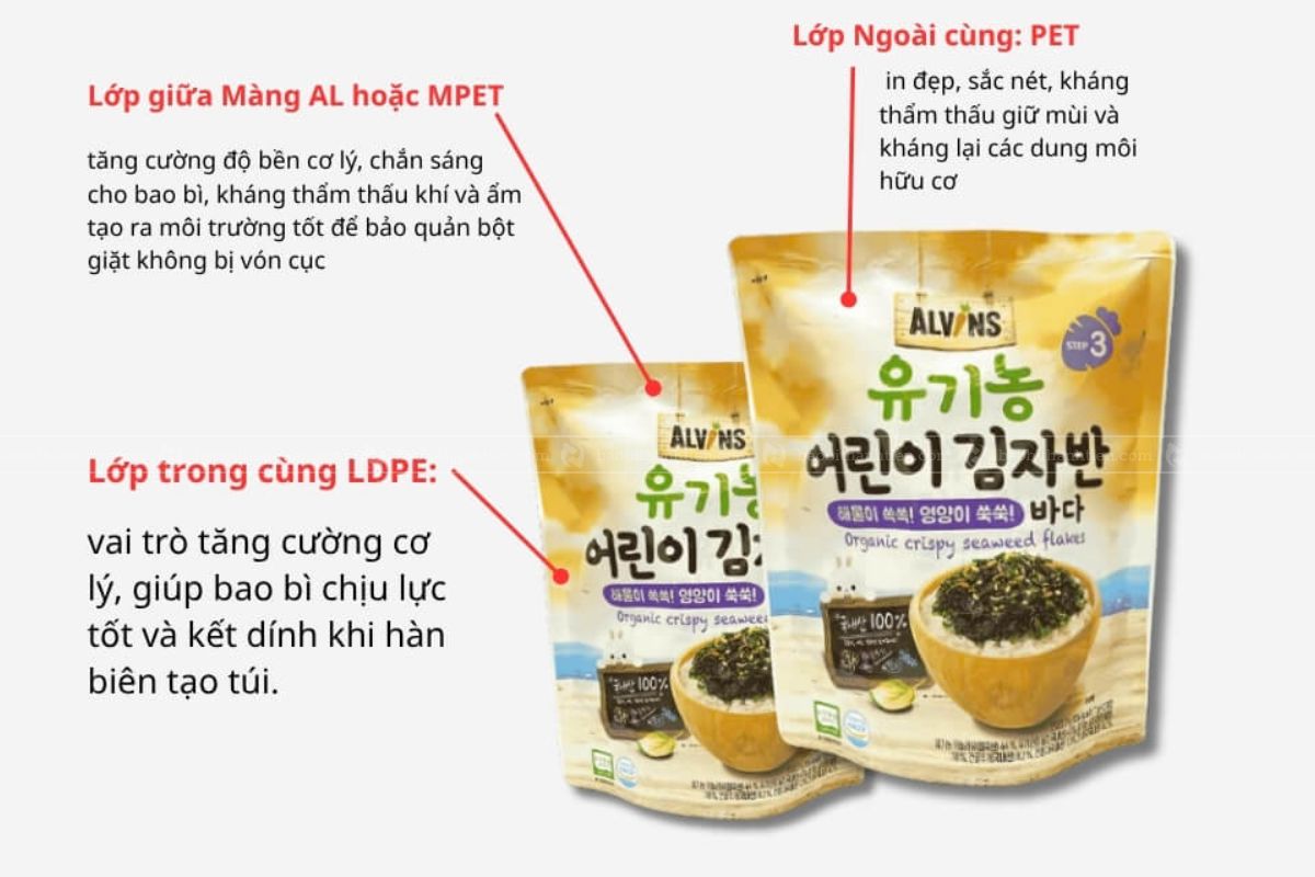 - Lớp giữa (AL/MPET): Ngăn hơi ẩm, khí oxy và ánh sáng, giúp rong biển giữ được độ giòn, hương vị và chất dinh dưỡng trong 12-18 tháng.