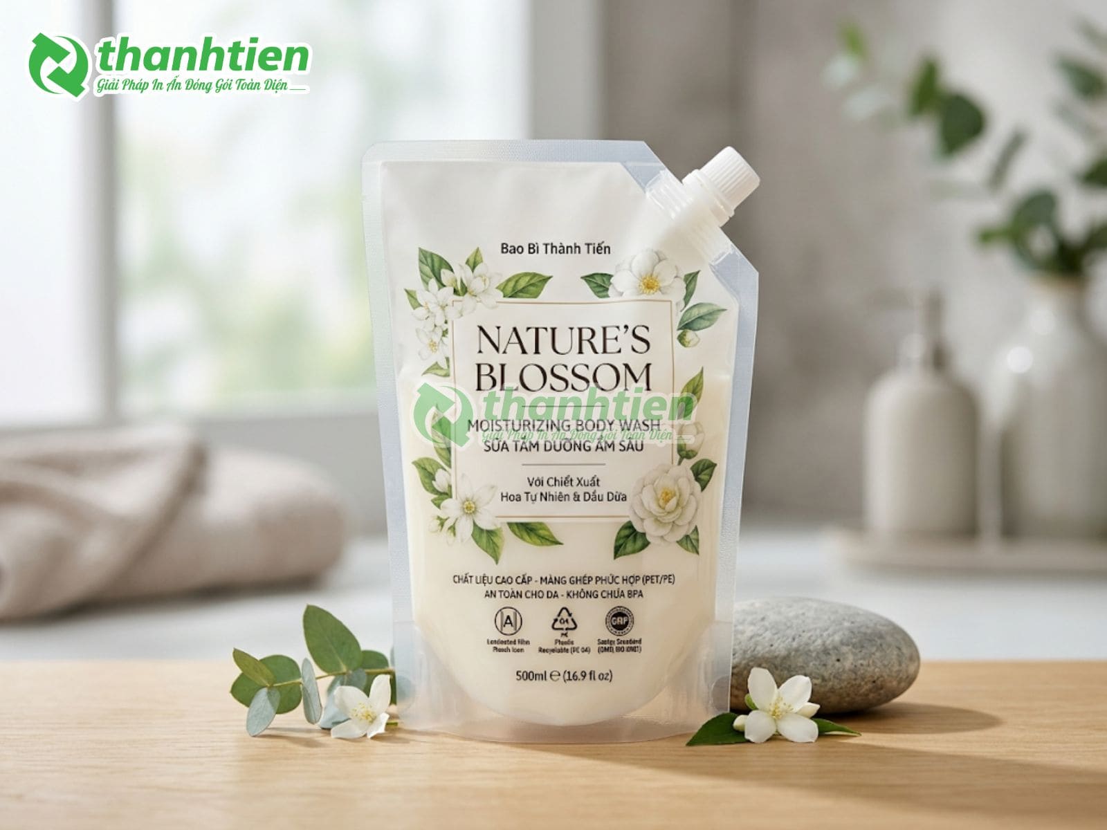Tất cả chất liệu đều không chứa BPA, không độc hại, đảm bảo an toàn tiếp xúc trực tiếp với da nhạy cảm. Nhờ công nghệ ép đùn và thổi màng hiện đại, bao bì có độ dày đồng đều, chống oxy hóa hiệu quả, giữ cho sữa tắm luôn tươi mới trong thời gian dài. Khách hàng có thể chọn lớp màng ghép phức hợp để tăng thêm tính năng chắn sáng, chắn mùi hoặc thân thiện môi trường theo yêu cầu riêng.