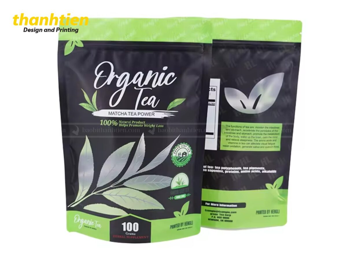 Bao bì đựng trà được cấu tạo từ nhiều màng ghép có thể từ 2 đến 3 lớp: PET/MPET/LLDPE; PET/LLDPE; PET/AL/LLDPE… Chính vì thế sẽ giúp bảo quản được sản phẩm giữ được hương vị và tạo độ thẩm mỹ cho sản phẩm.