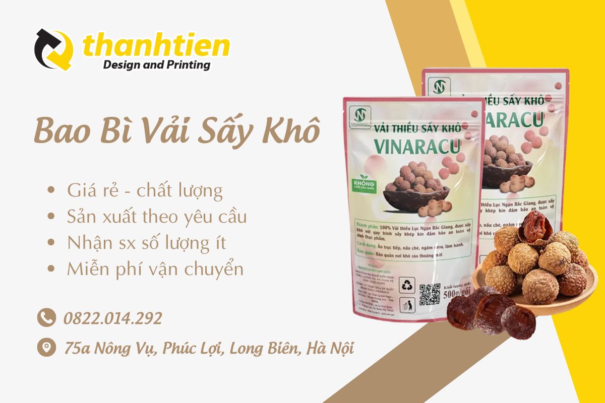Vải sấy khô là món ăn vặt thơm ngon, bổ dưỡng đang ngày càng được ưa chuộng tại Việt Nam nhờ hương vị đặc trưng và khả năng bảo quản lâu dài. Để sản phẩm này đến tay người tiêu dùng với chất lượng tốt nhất, bao bì đóng vai trò cực kỳ quan trọng. Trong bài viết này, chúng ta sẽ cùng khám phá chi tiết về bao bì vải sấy khô – từ chất liệu, kích thước, thông tin in ấn đến các loại bao bì phổ biến, lợi ích vượt trội và những mẫu thiết kế ấn tượng. Đặc biệt, nếu bạn đang tìm kiếm một địa chỉ sản xuất bao bì uy tín, giá rẻ tại Hà Nội thì đừng bỏ qua Xưởng Bao Bì Thành Tiến!
