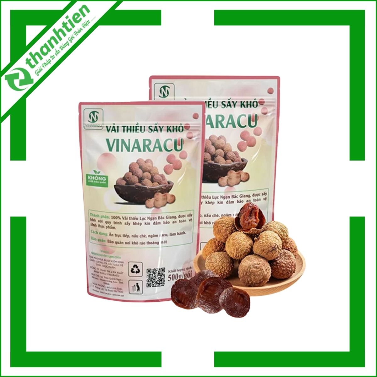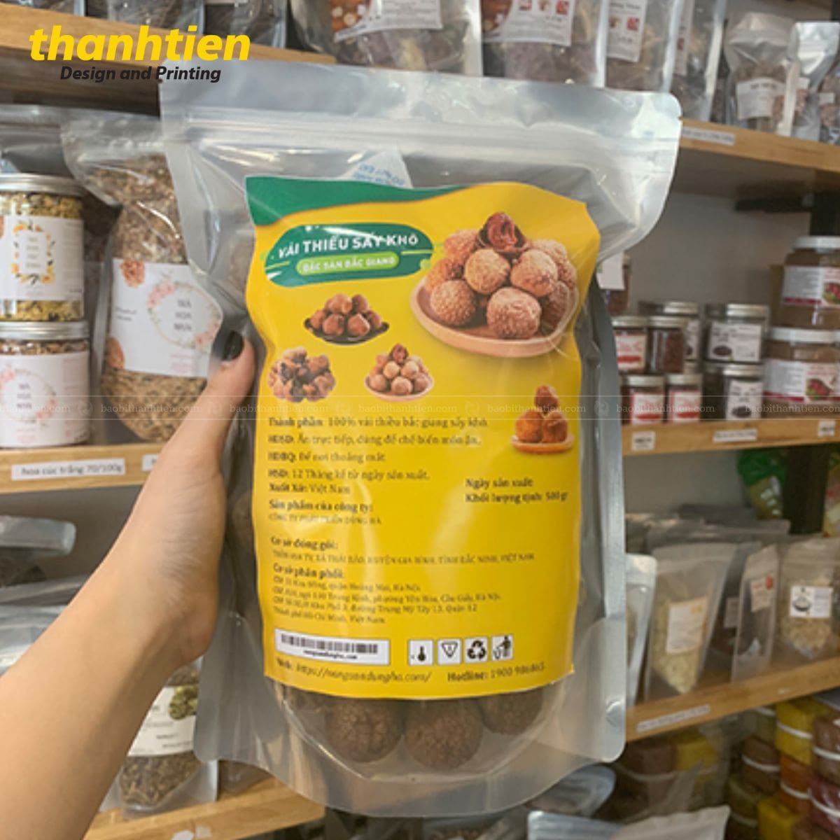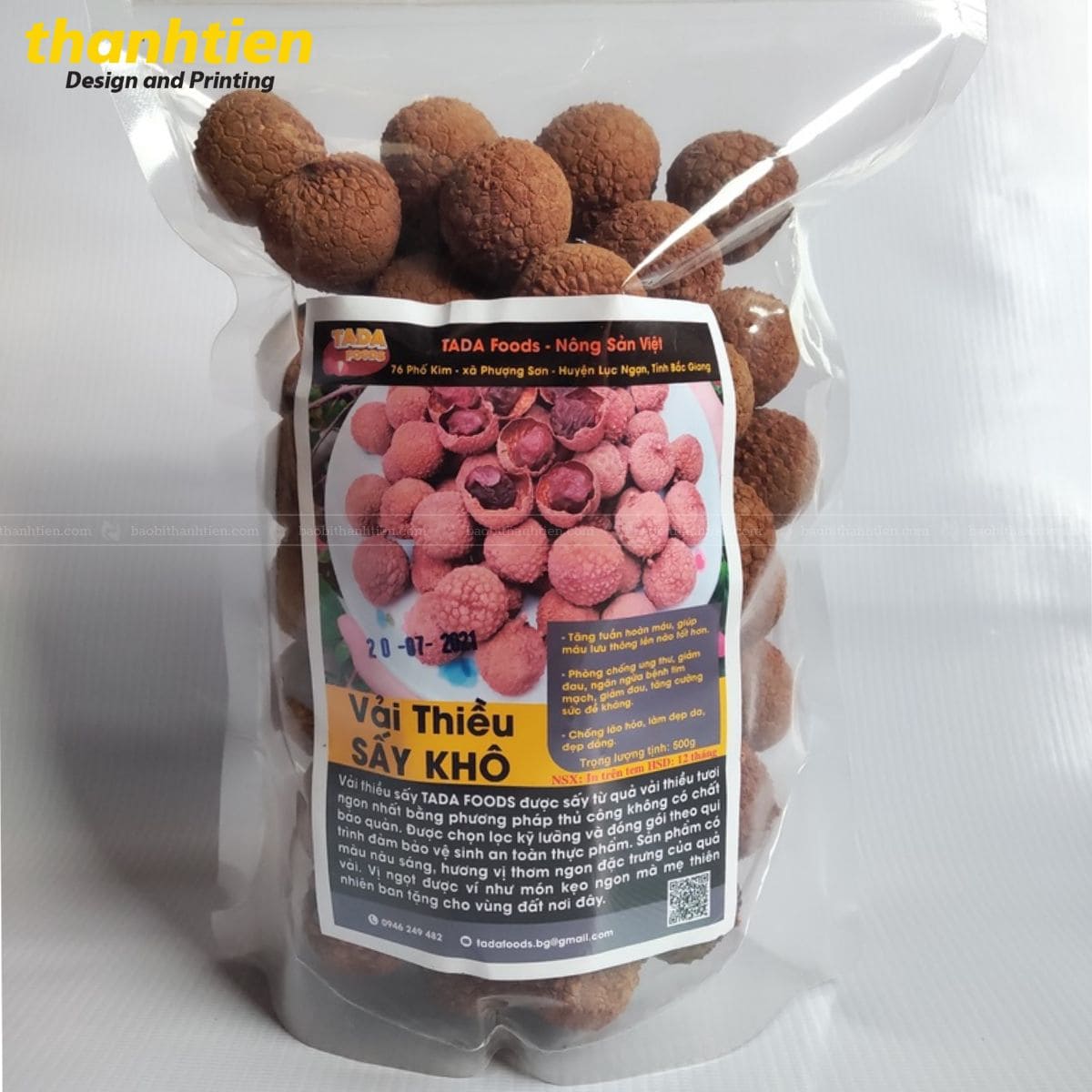 - Chứa đựng, đóng gói sản phẩm vải sấy khô luôn đảm bảo chất lượng và hương thơm đến tay khách hàng. Tạo điều kiện thuận lợi cho quá trình vận chuyển, lưu trữ và trưng bày bán sản phẩm trên kệ hàng.