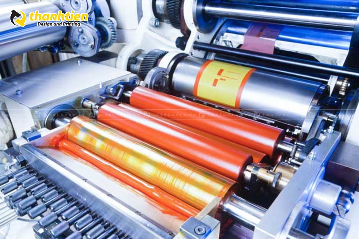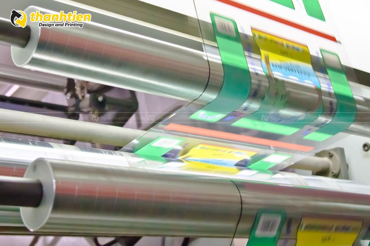 Máy in chạy liên tục theo cuộn hoặc theo từng sản phẩm. Mực được kiểm soát để đảm bảo đồng đều, không lem mờ, sai màu.