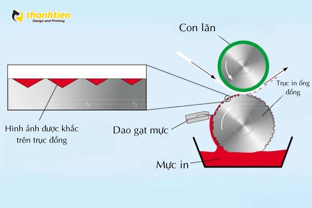 Sau đó, một dao gạt mực sẽ được sử dụng để gạt sạch những mực thừa ra khỏi bề mặt khuôn in, chỉ để lại mực trong các chỗ lõm của các phần tử in. Quá trình này giúp tạo ra hình ảnh hoặc văn bản chính xác và sắc nét trên bề mặt ống đồng.