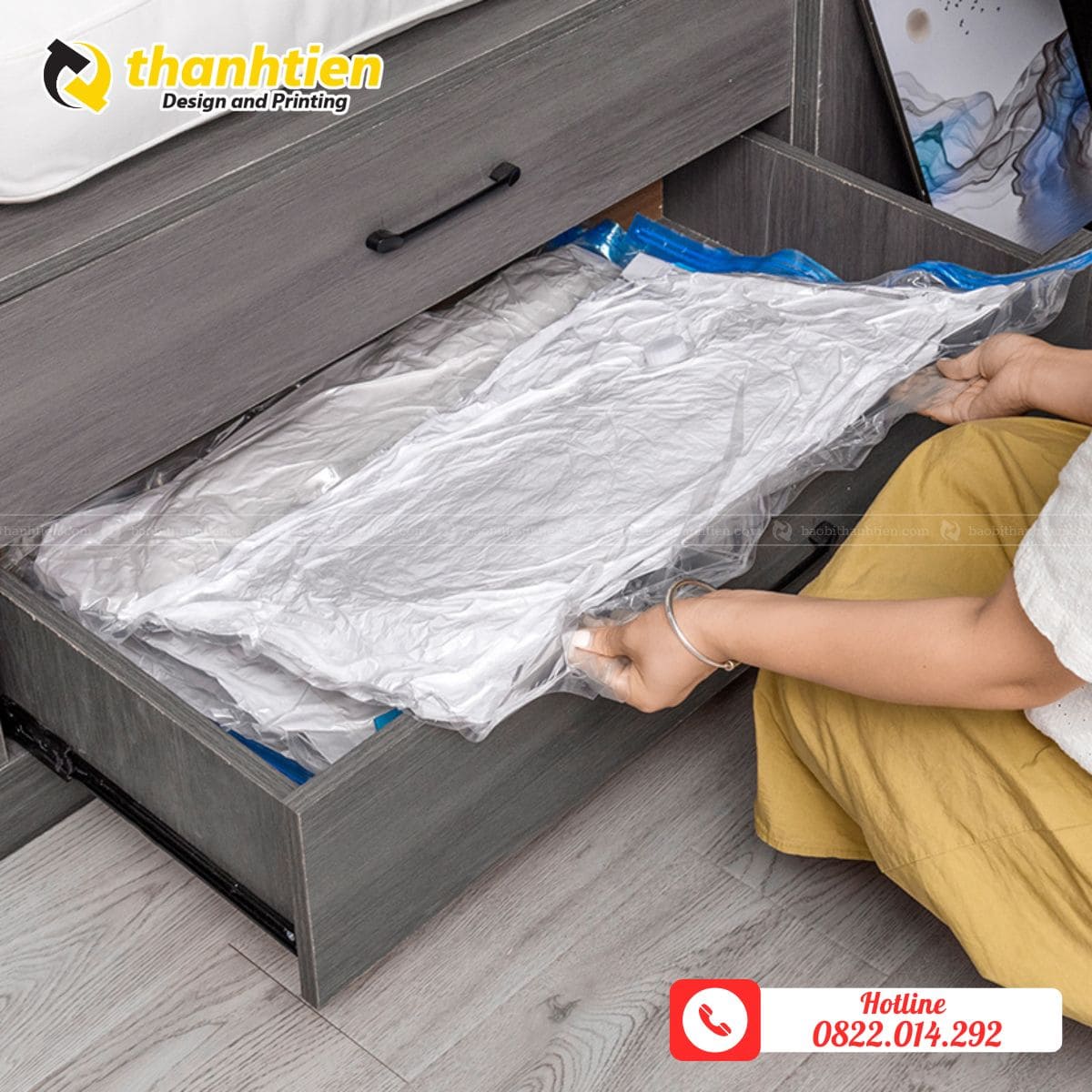 Một trong những ưu điểm lớn nhất của túi hút chân không đựng quần áo là khả năng giảm kích thước đồ dùng xuống đáng kể. Các loại quần áo mùa đông cồng kềnh như áo khoác, áo len hay chăn màn đều có thể được nén gọn gàng trong túi, giúp tủ đồ của bạn trở nên ngăn nắp hơn bao giờ hết. Với túi hút chân không size lớn từ Bao Bì Thành Tiến, bạn thậm chí có thể bảo quản cả những chiếc chăn bông dày mà không lo chiếm quá nhiều diện tích.