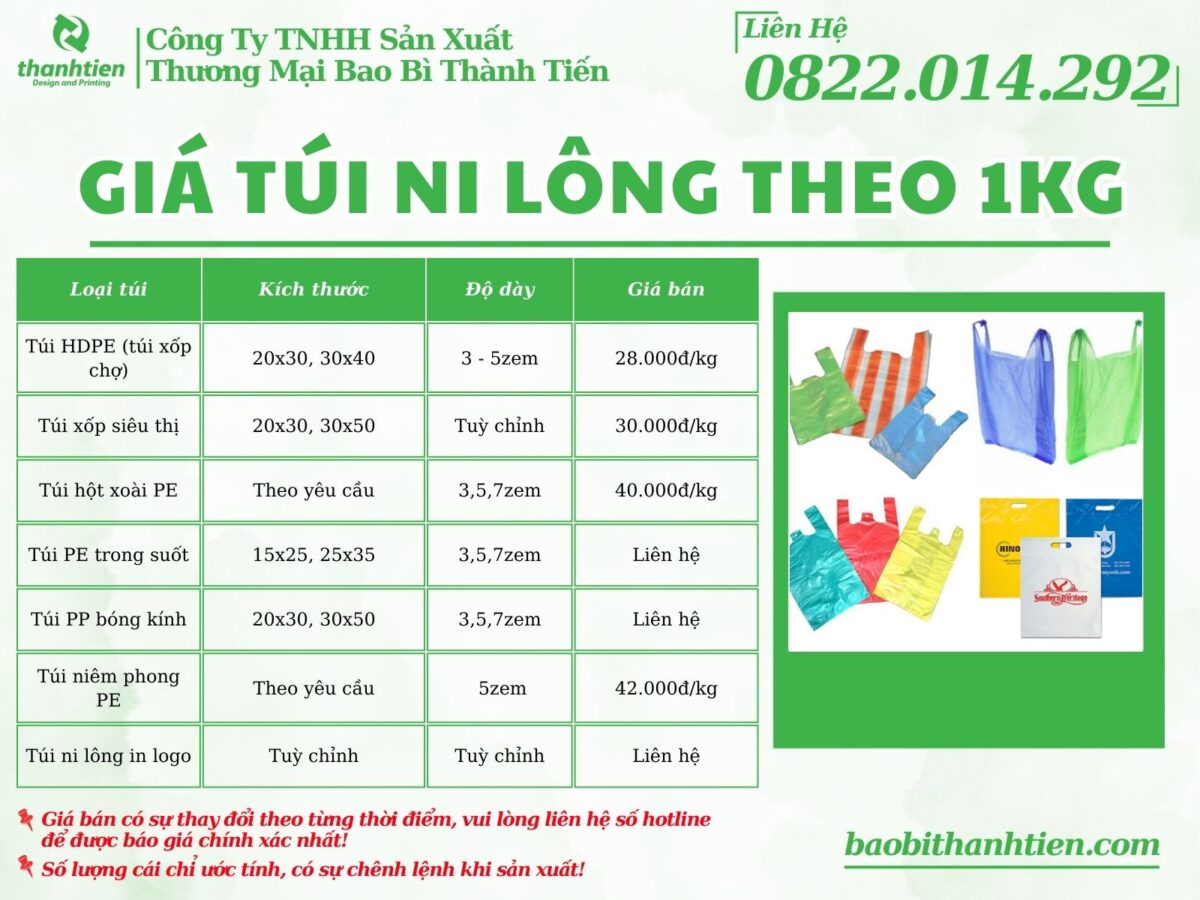Giá túi ni lông 1kg trên thị trường hiện nay dao động từ 20.000 VNĐ đến 80.000 VNĐ, tùy thuộc vào nhiều yếu tố như chất liệu, kích thước, độ dày, màu sắc, và số lượng đặt hàng. Dưới đây là bảng giá tham khảo tại Bao Bì Thành Tiến (cập nhật năm 2025):