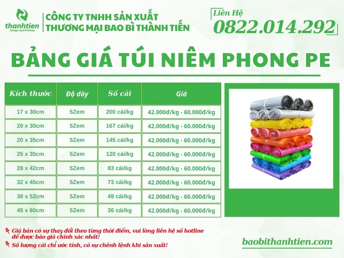 I. Bảng Giá Và Kích Thước Túi Niêm Phong Tại Thành Tiến