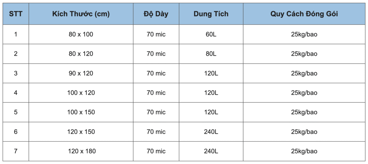 Bảng kích thước túi đựng rác công nghiệp tại Thành Tiến
