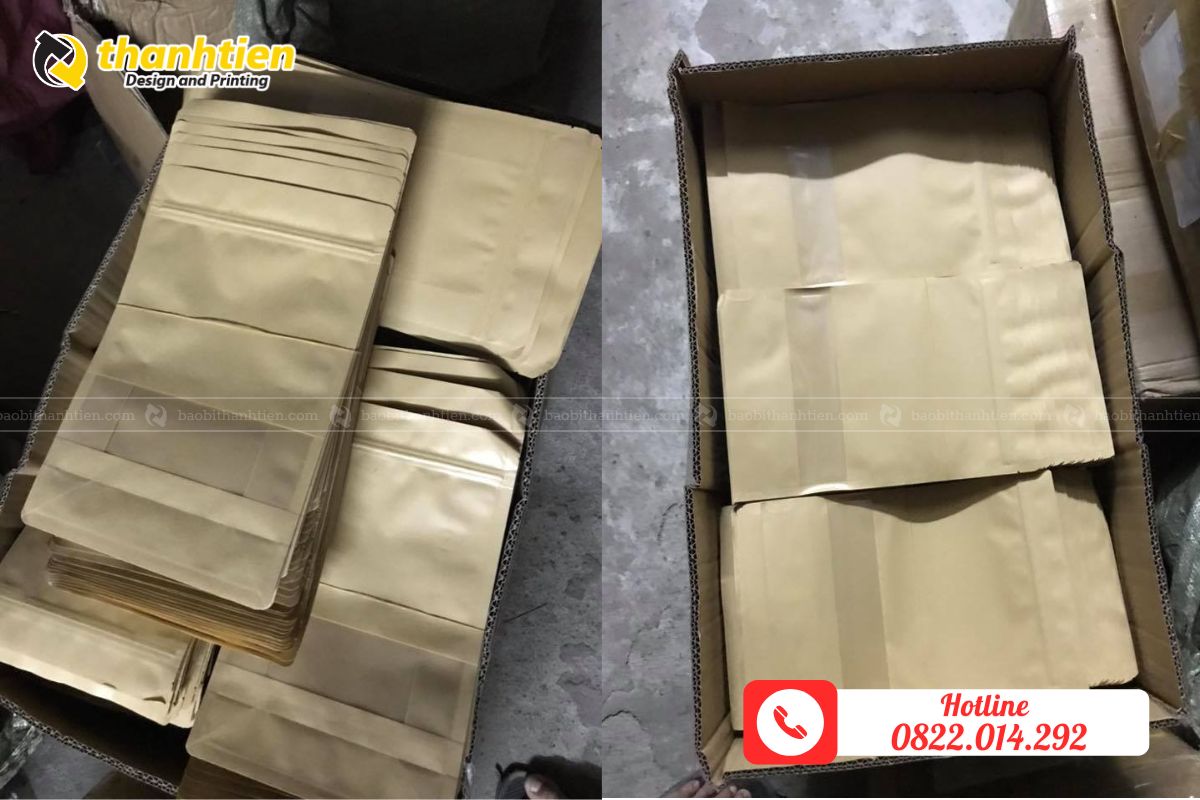 Đội ngũ kỹ thuật viên giàu kinh nghiệm cùng bộ phận thiết kế chuyên nghiệp của chúng tôi luôn sẵn sàng hỗ trợ khách hàng từ khâu tư vấn, thiết kế logo miễn phí, đến sản xuất và giao hàng nhanh chóng trên toàn quốc. Chúng tôi cam kết mang đến dịch vụ tận tâm, sản phẩm sắc nét, bền màu, và chính sách bảo hành rõ ràng với đổi trả 100% nếu có lỗi từ nhà sản xuất. Để trải nghiệm dịch vụ và đặt hàng, quý khách vui lòng liên hệ qua hotline 0822.014.292, Zalo, email hoặc fanpage. Bao Bì Thành Tiến – đối tác tin cậy giúp bạn nâng tầm thương hiệu với những mẫu túi zipper giấy kraft chất lượng hàng đầu!